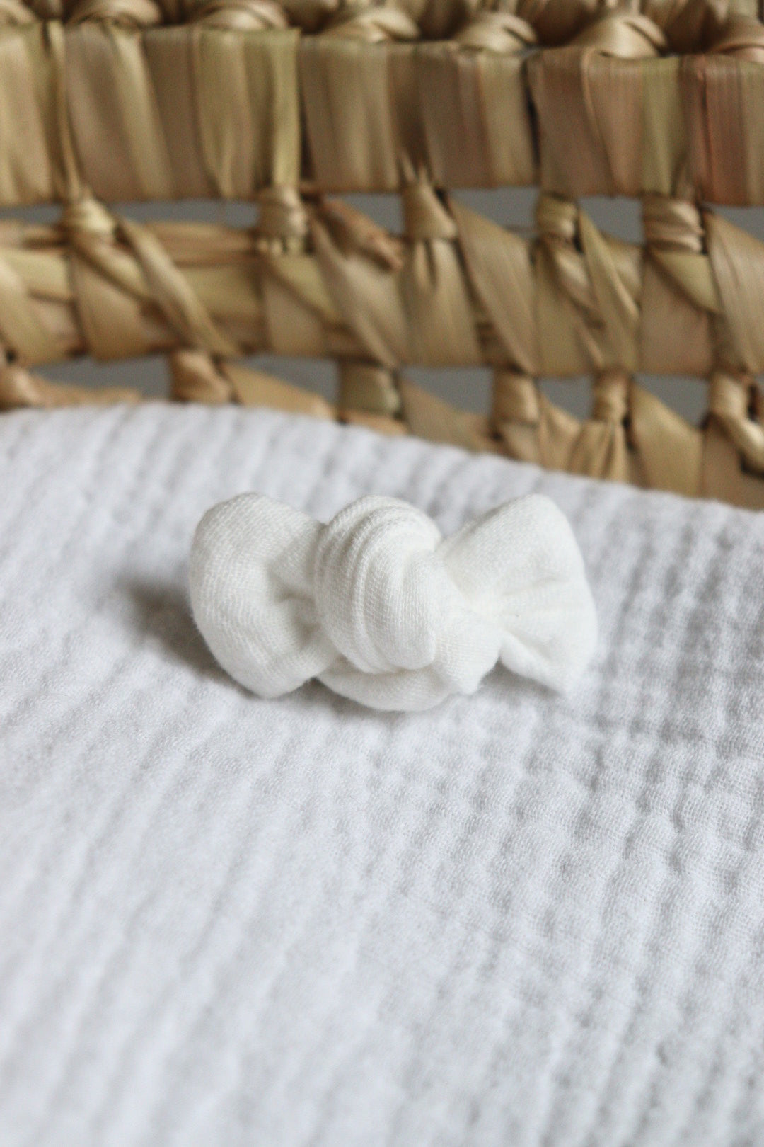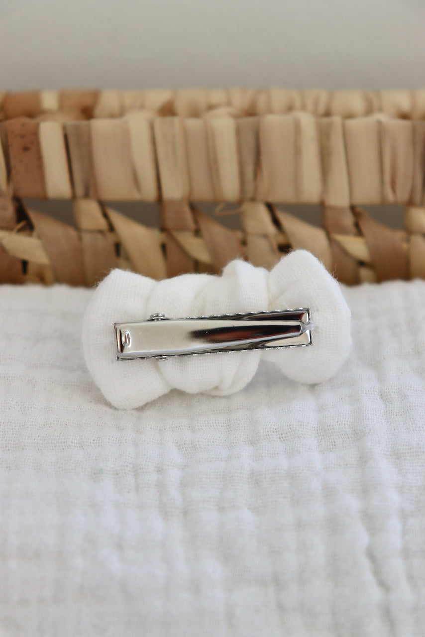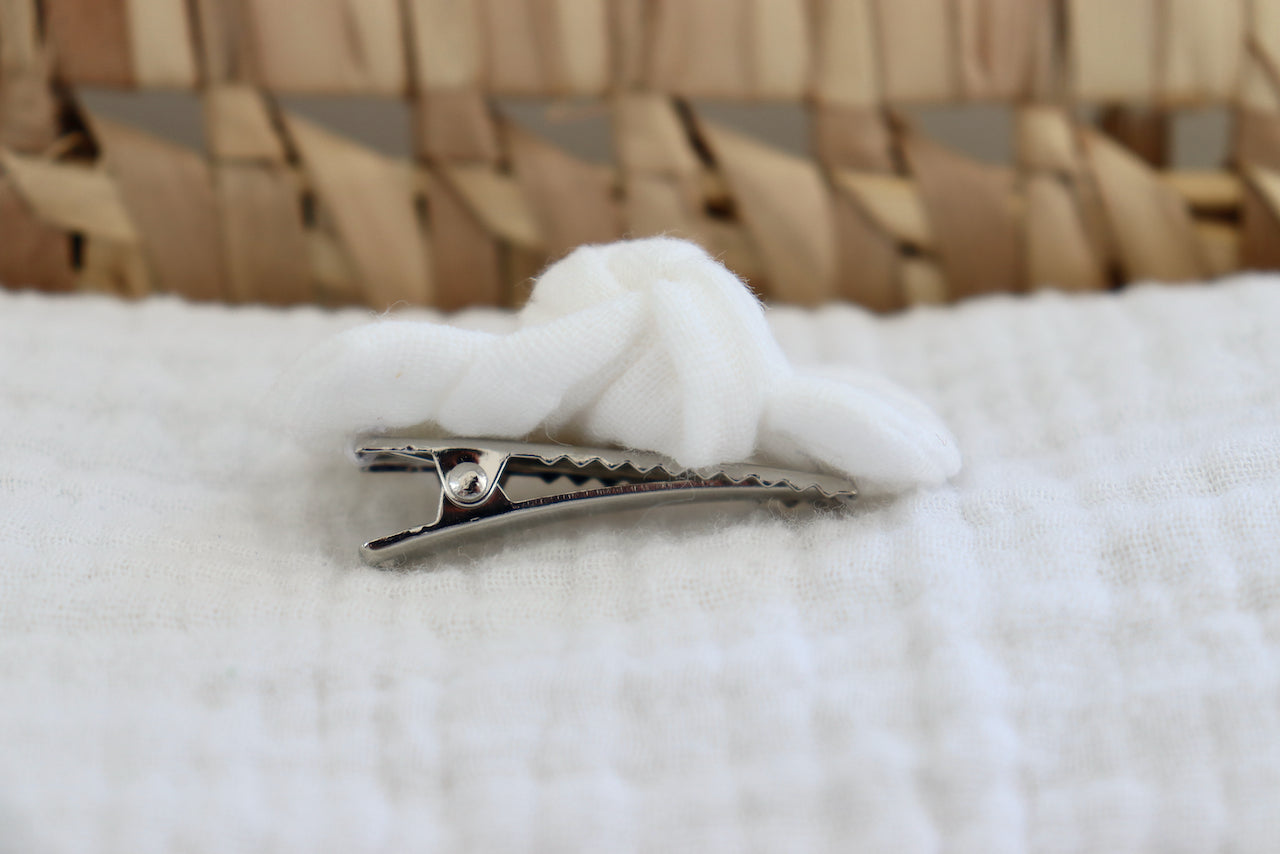 Barrette crocodile cousue sur un noeud. Son attache en forme de pince permet une pose facile sur les cheveux et ne glisse pas.
