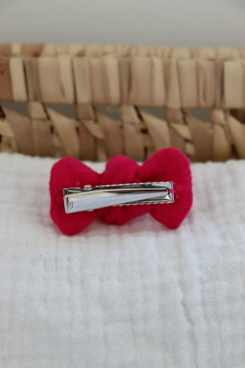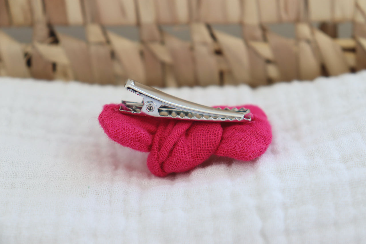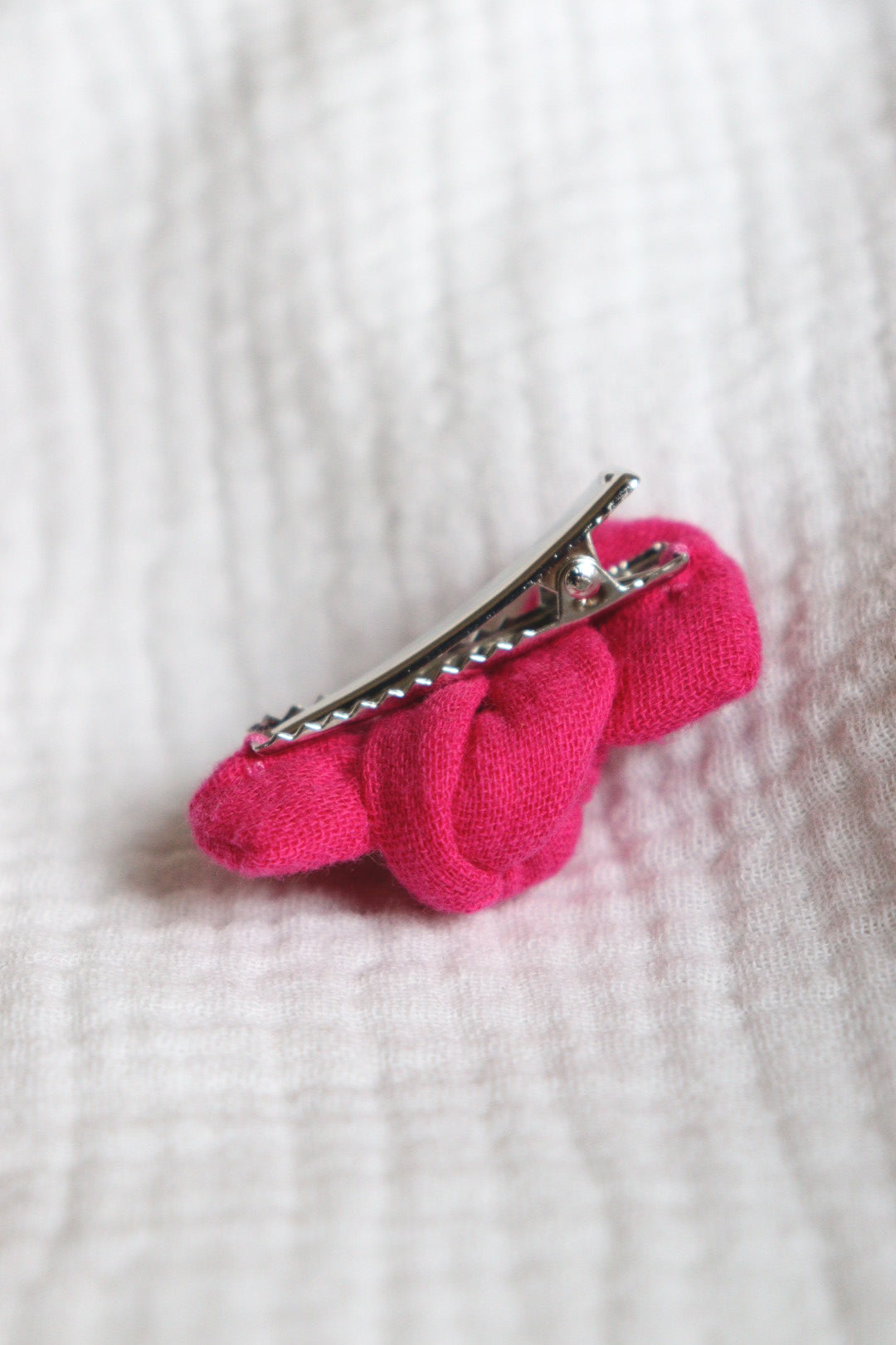 Barrette crocodile cousue sur un noeud. Son attache en forme de pince permet une pose facile sur les cheveux et ne glisse pas.