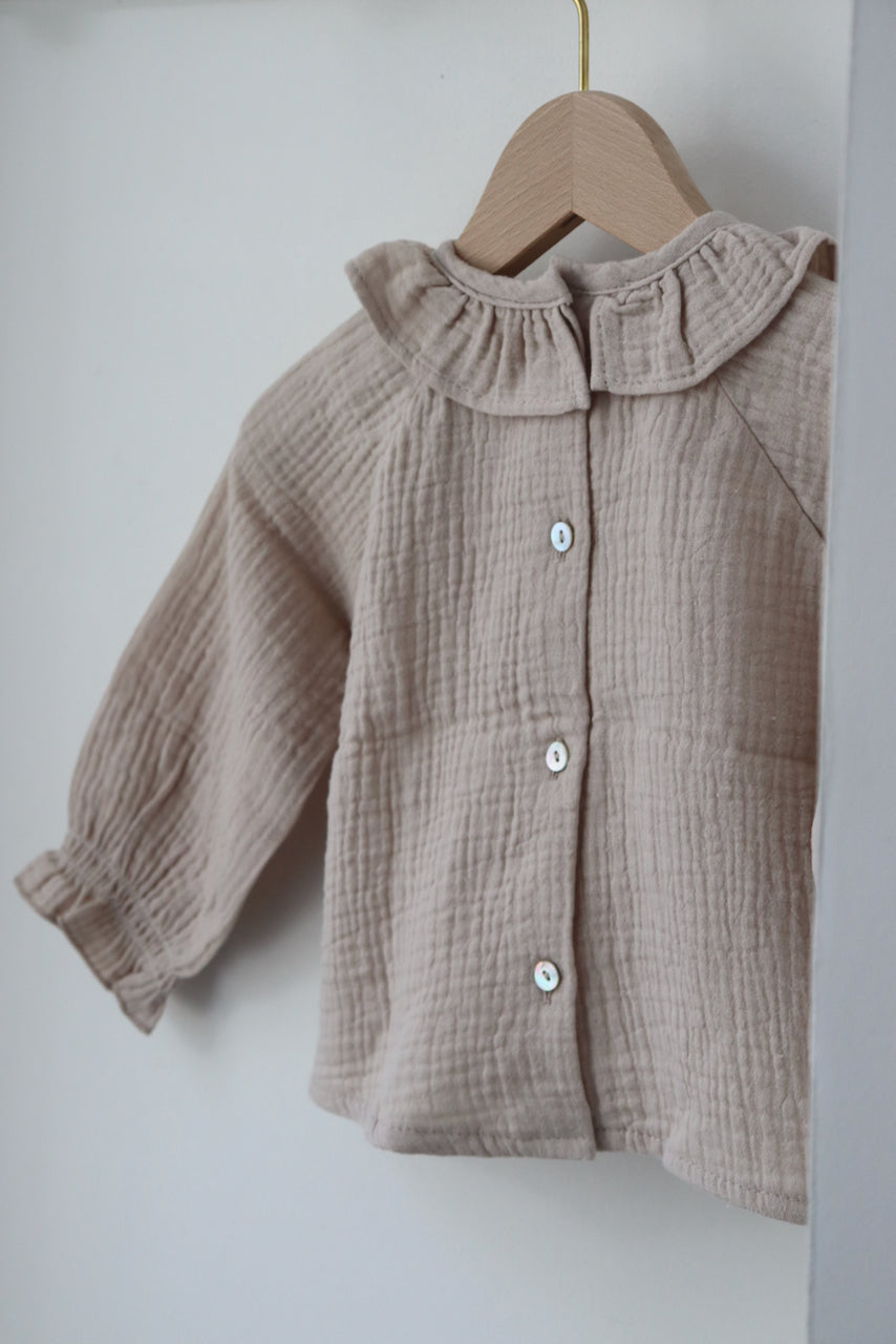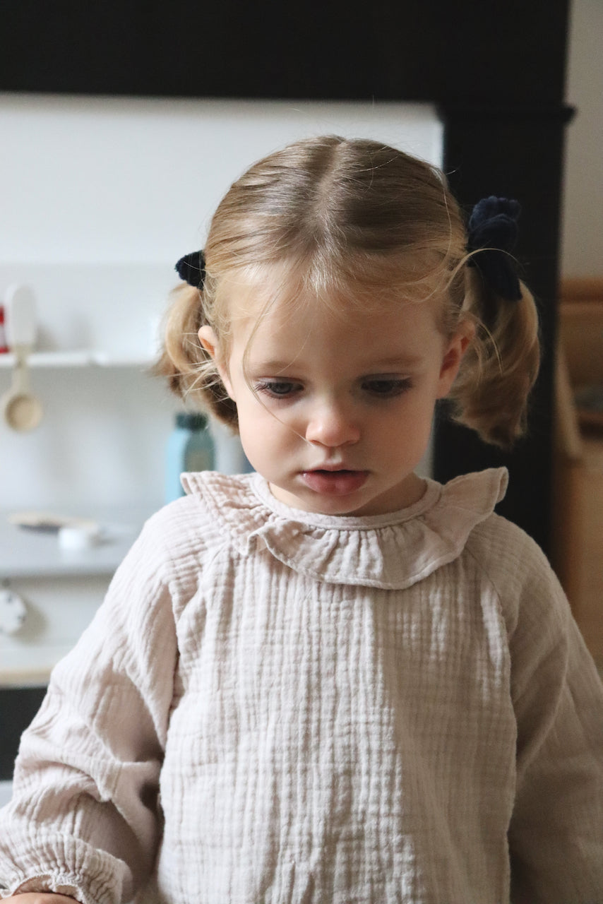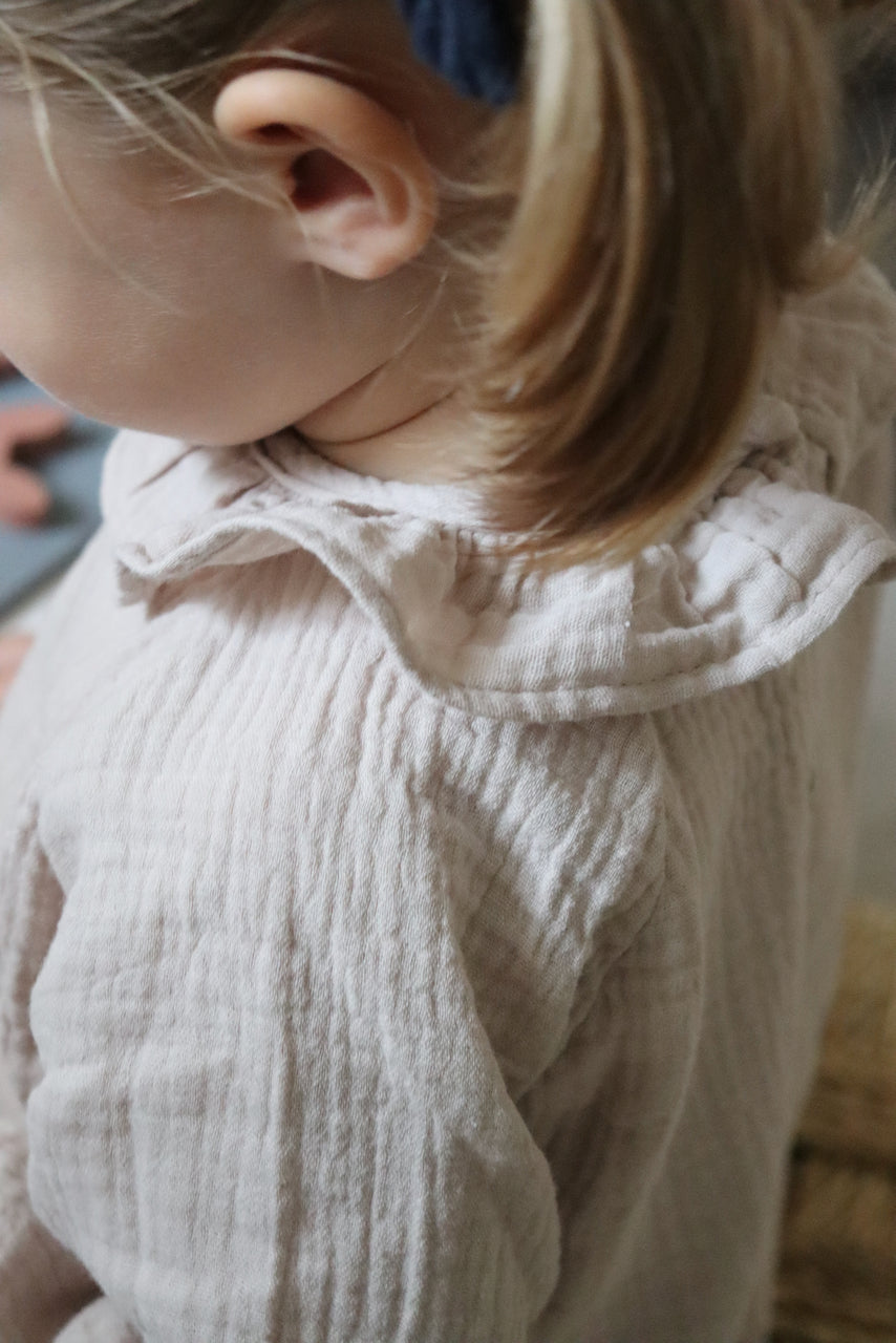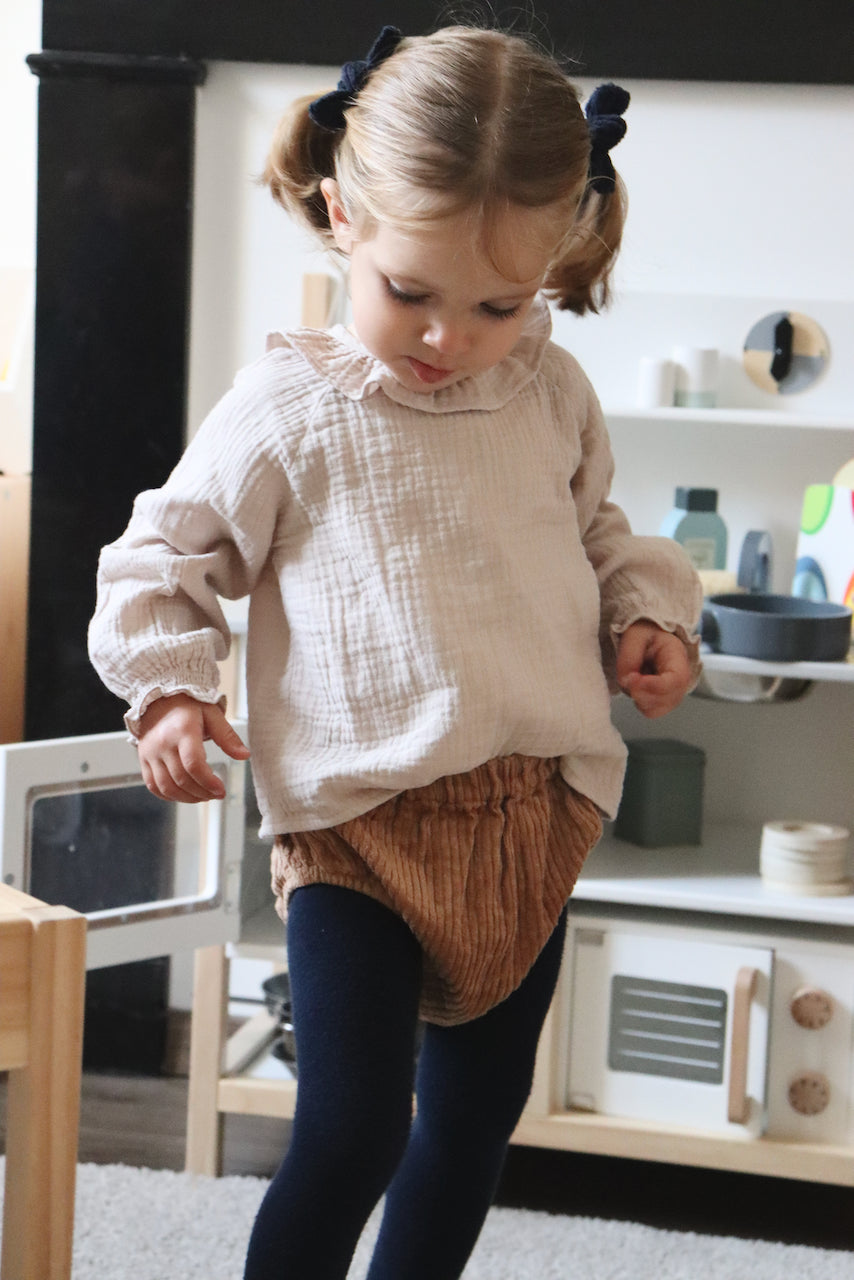 Charlie, c'est la blouse parfaite pour les petites filles. Celle qui s'accorde à presque toutes les tenues : en dessous d'une salopette, avec un jeans, un bloomer. Et même sous un pull, son joli petit col et ses manches froncées qui dépassent feront la différence.
