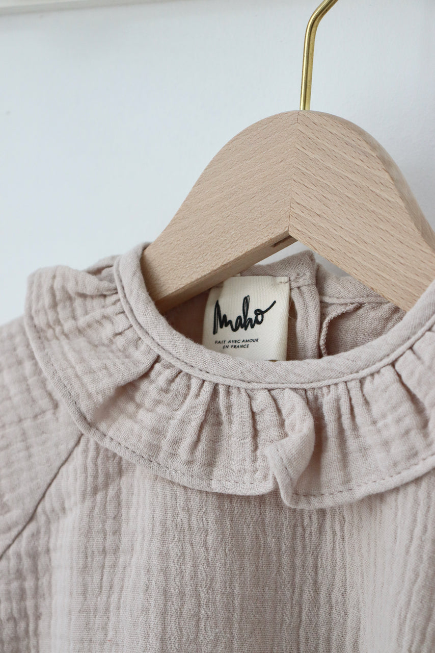 On adore ses jolis détails : boutons en nacre naturelle sur l'arrière, col volanté, manches en élastiques smocks et point bourdon.