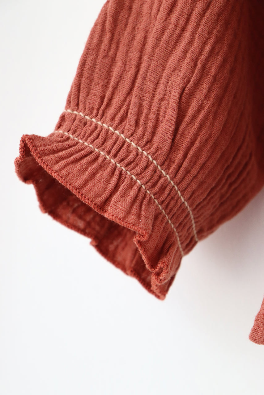 On adore ses jolis détails : boutons en nacre naturelle sur l'arrière, col volanté, manches en élastiques smocks et point bourdon.