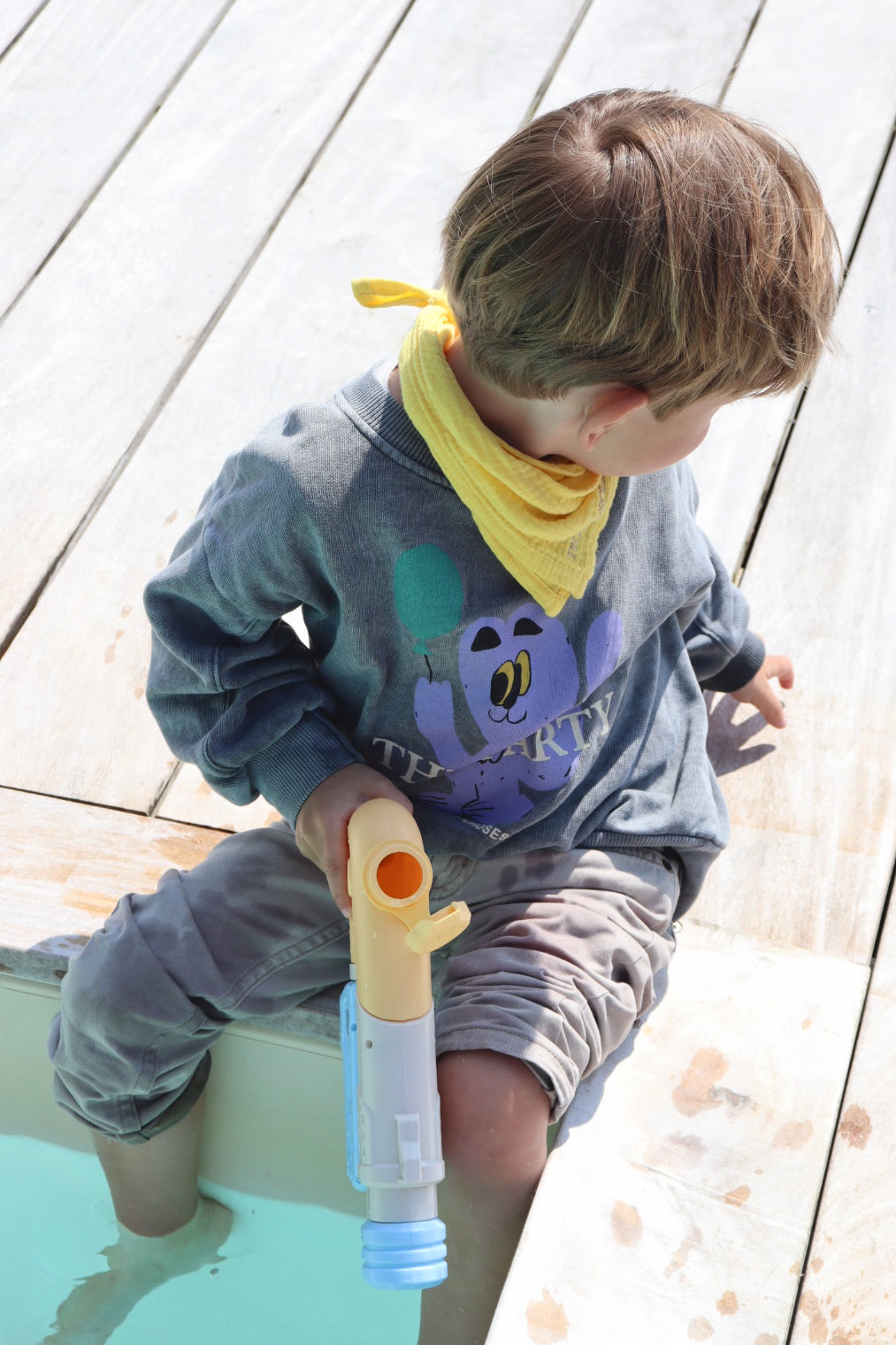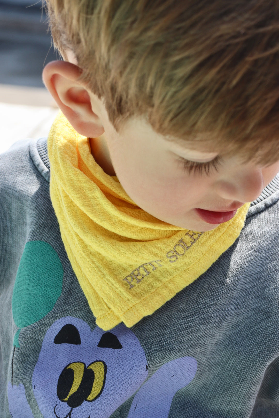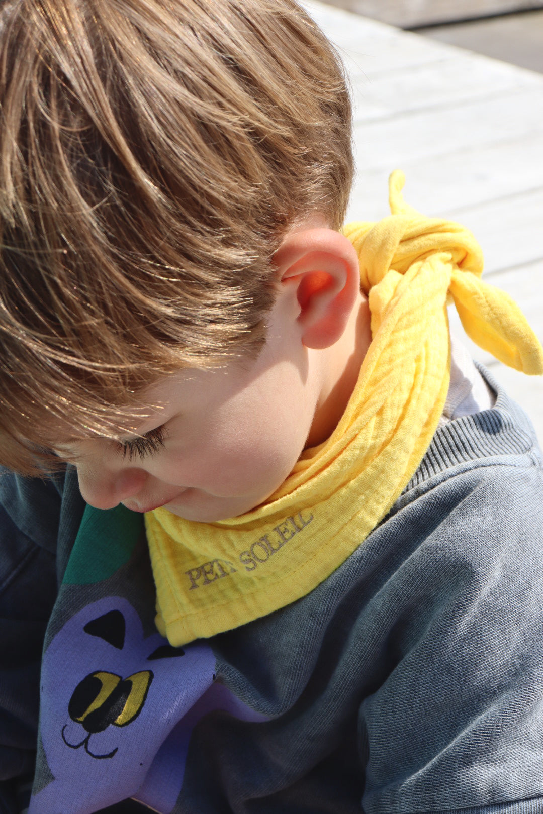 Peut se porter en bandana dans les cheveux jusque 2 ans environ, servir de lange, de doudou ou d'attache tétine.