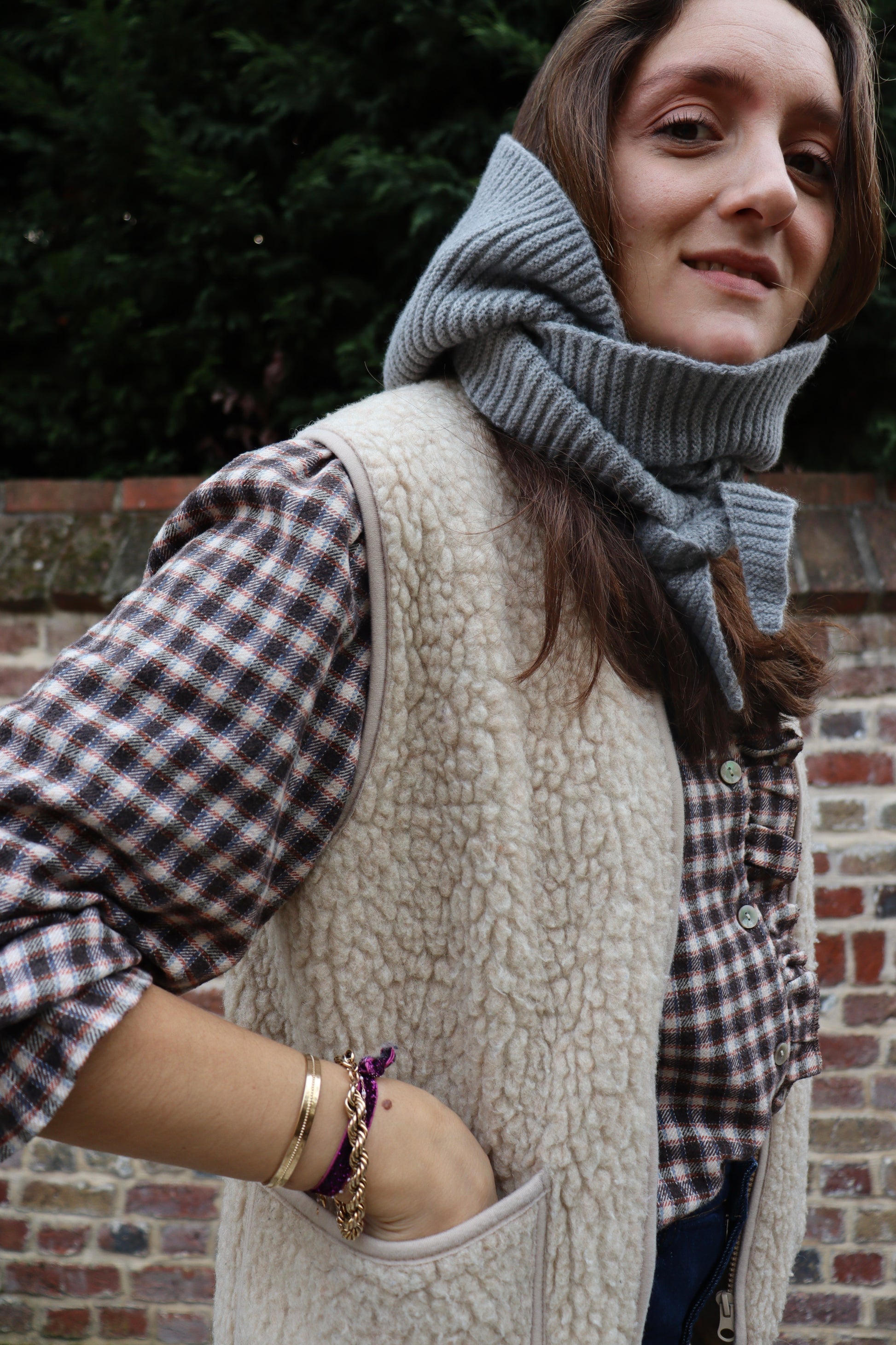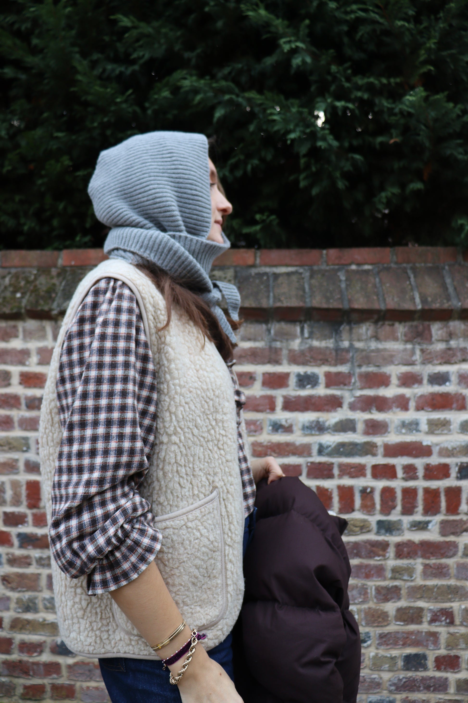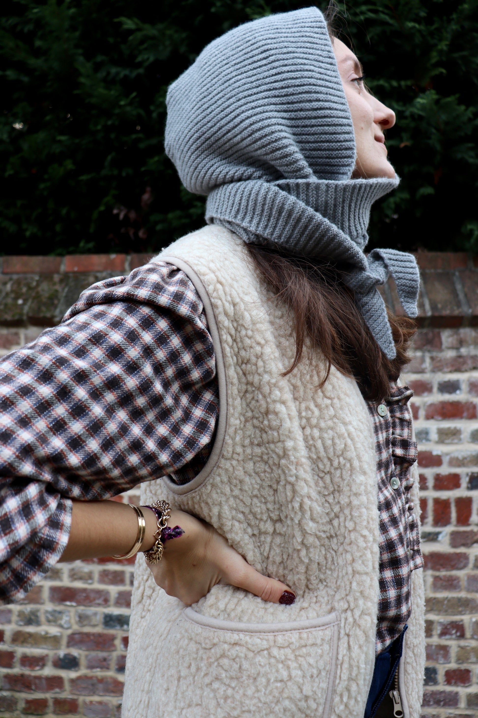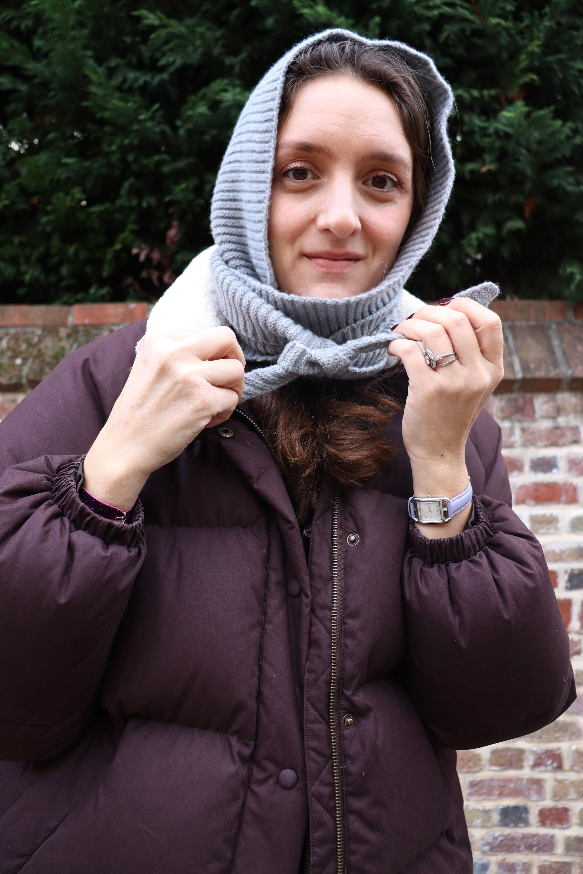 Elle se porte aussi en effet capuche sur un manteau en laine : pas besoin de la garder en permanence, elle s’adapte à chaque moment de la journée.