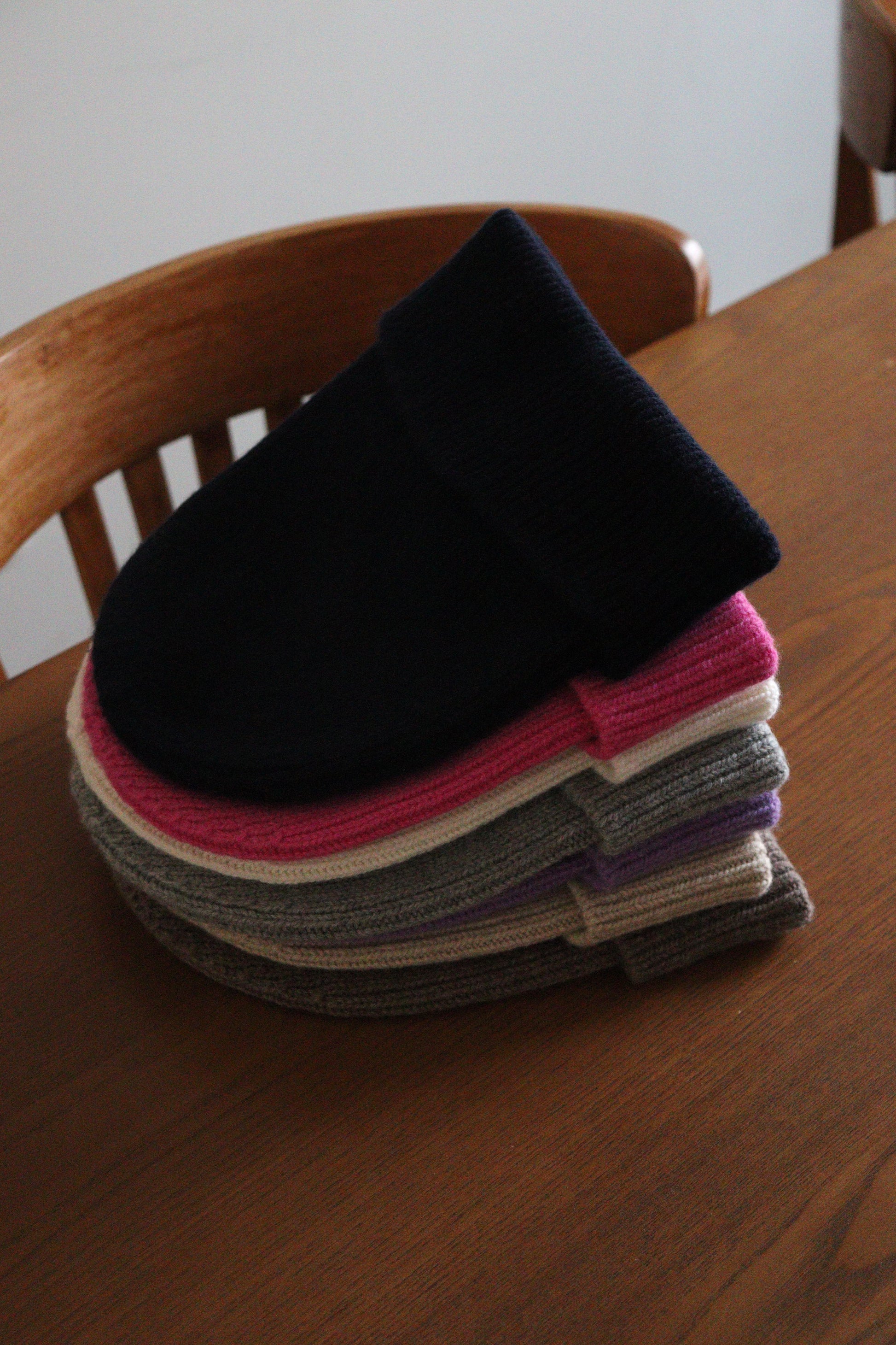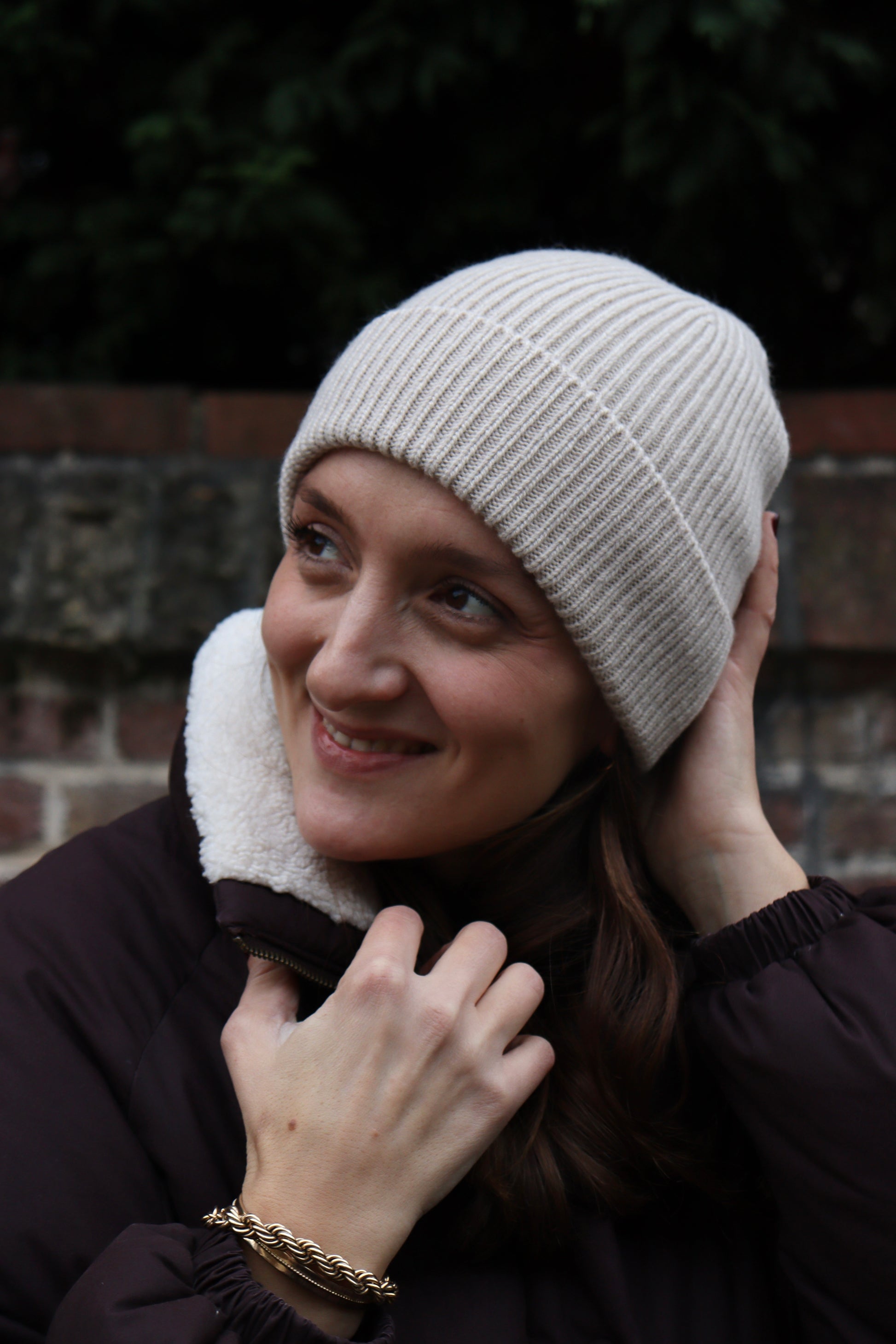 Sa maille côtelée en laine et cachemire, agrémentée d’un joli revers, lui offre une allure simple, intemporelle et mixte.