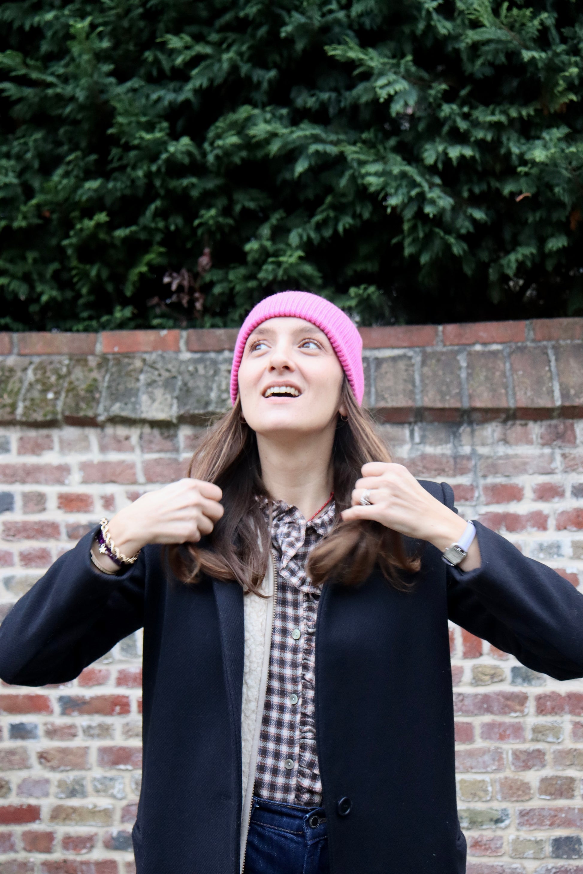 Sa maille côtelée en laine et cachemire, agrémentée d’un joli revers, lui offre une allure simple, intemporelle et mixte.
