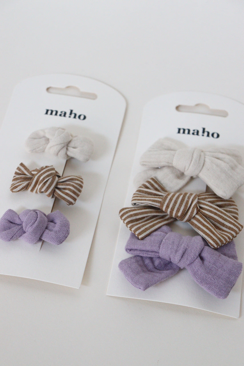 Assortiment de 3 barrettes Abby: gaze crème, gaze lilas et coton rayé ocre/crème