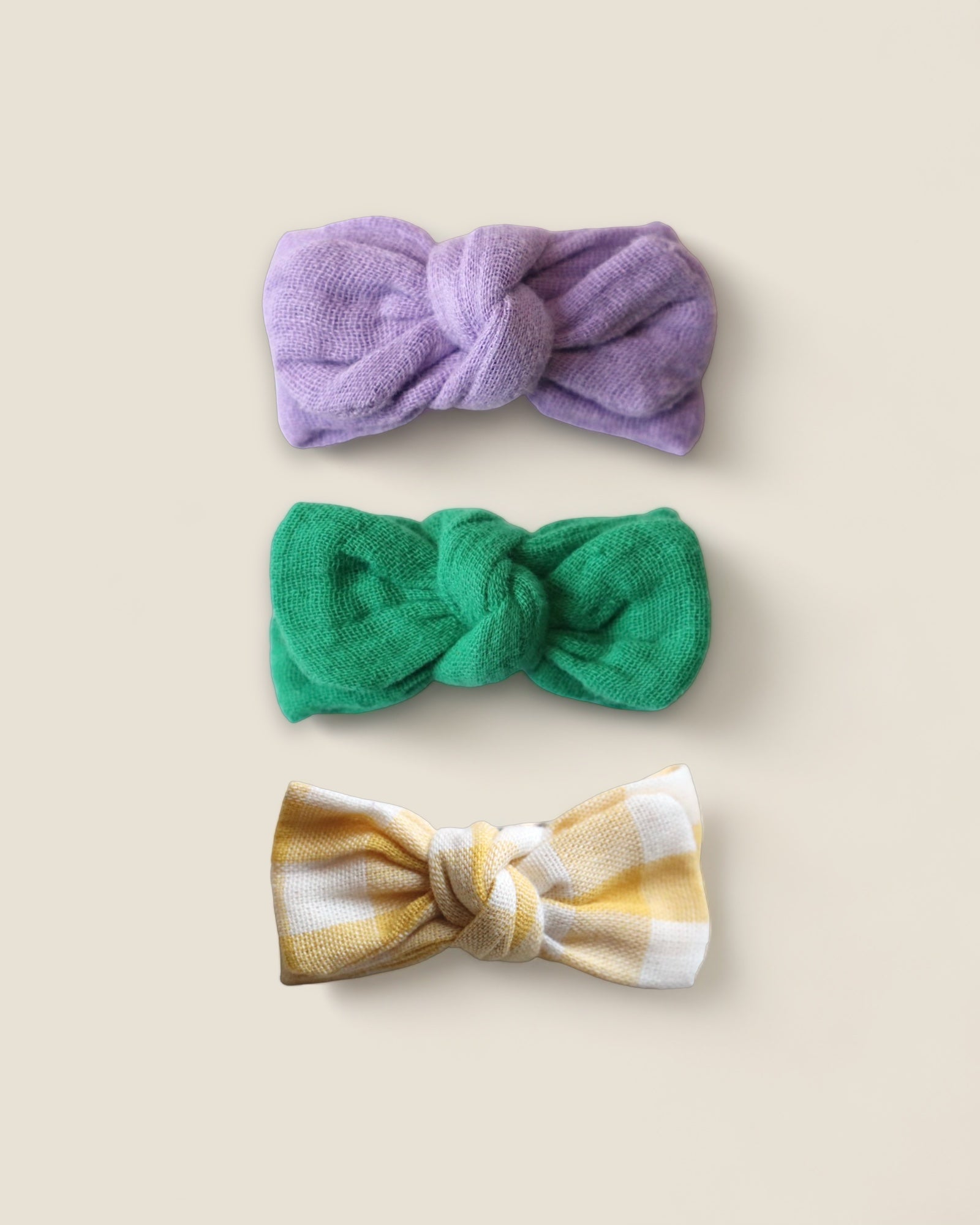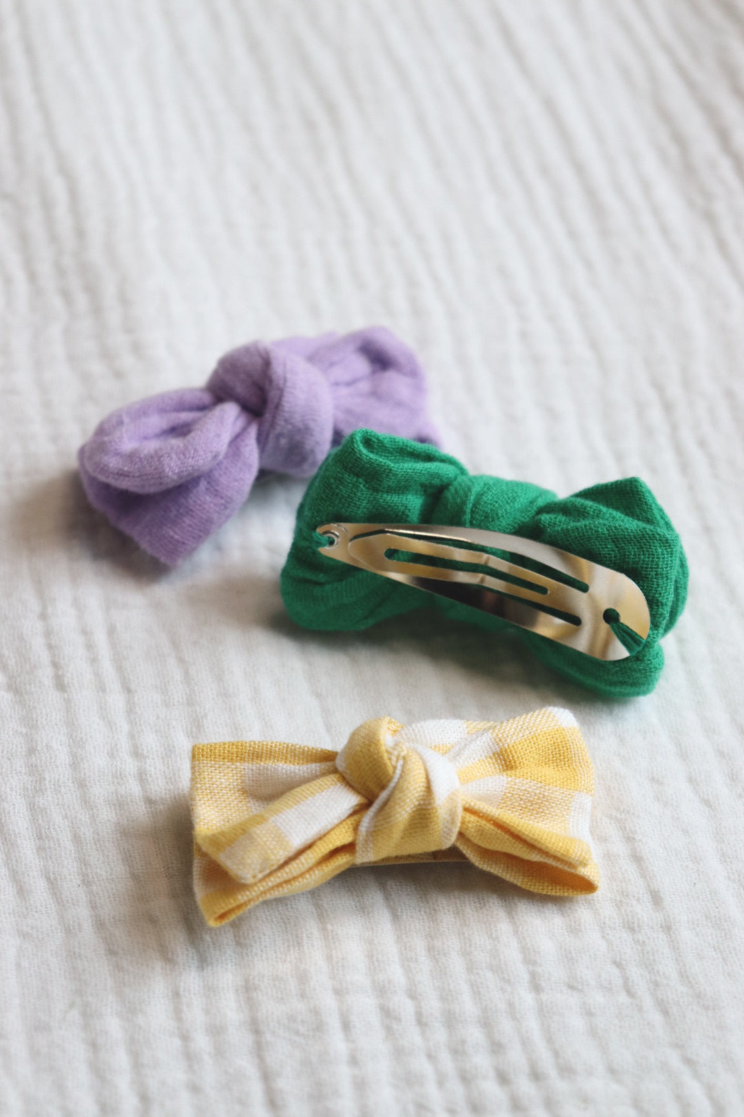 Lot de 3 barrettes Anna Baby ou Girl : gaze Lilas, gaze Vert et vichy Jaune. Monture clic-clac cousue sur un noeud en tissu.