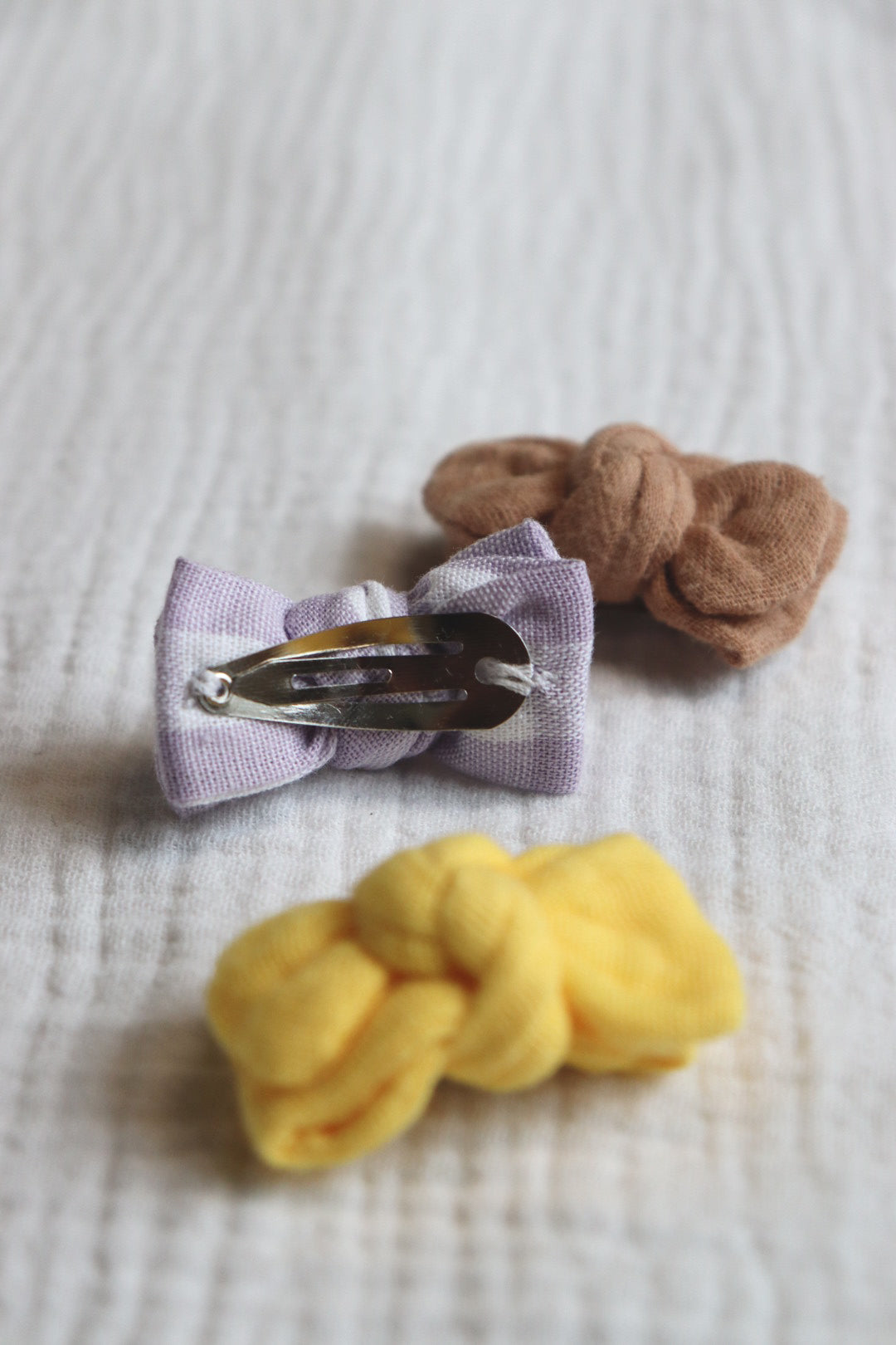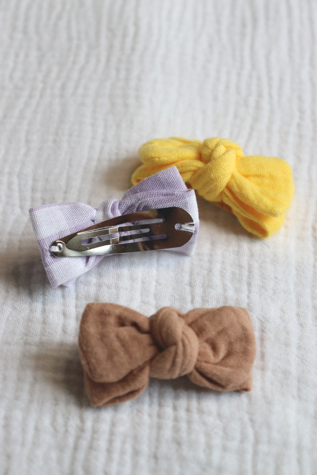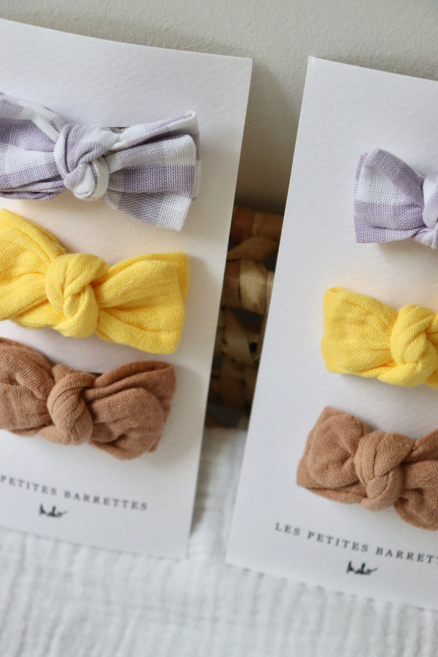 Lot de 3 barrettes Anna Baby ou Girl : gaze Argile, gaze Jaune et vichy Lilas Monture clic-clac cousue sur un noeud en tissu.