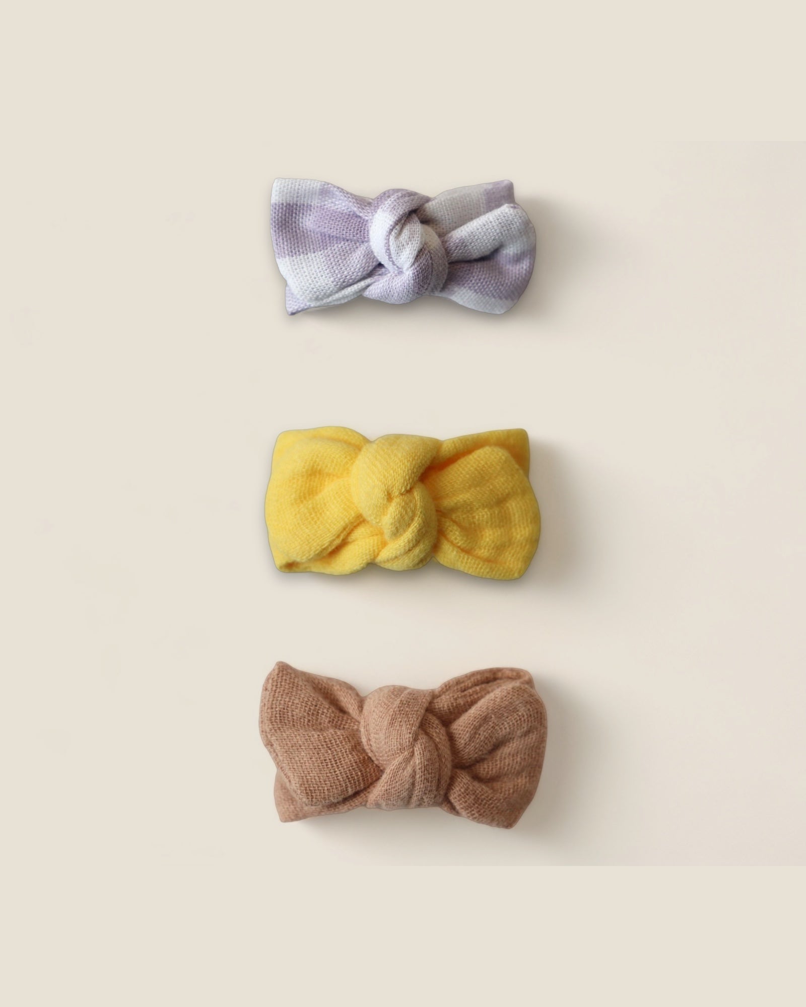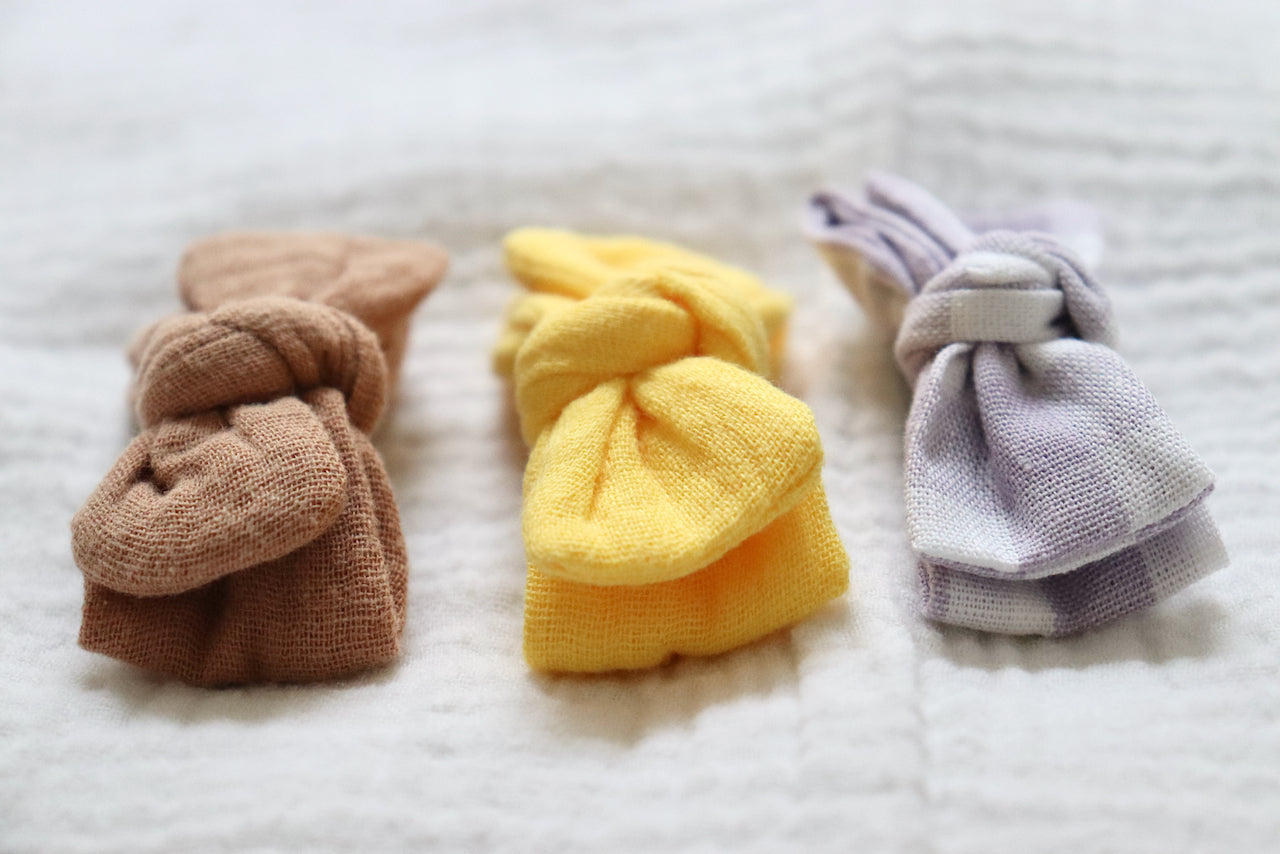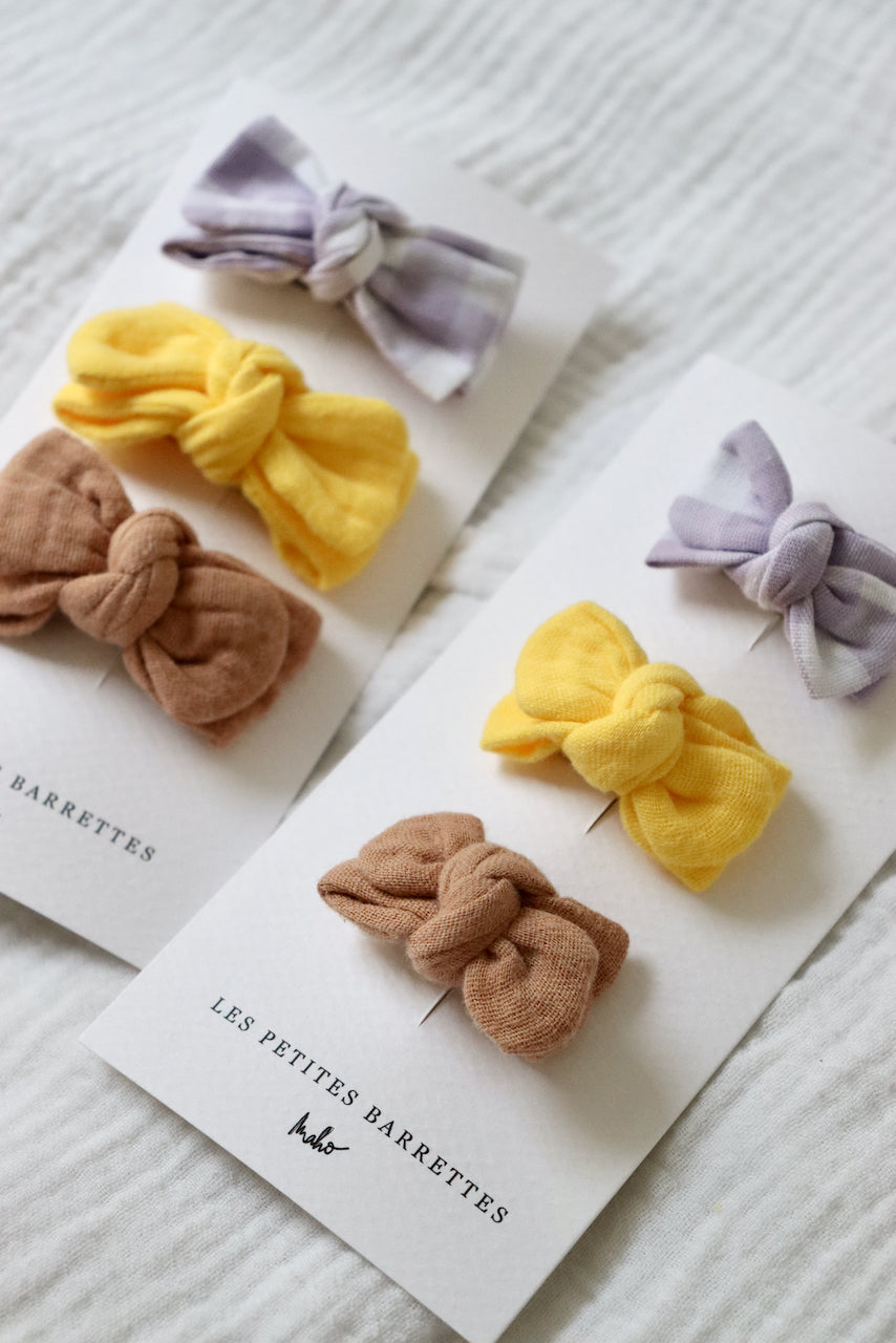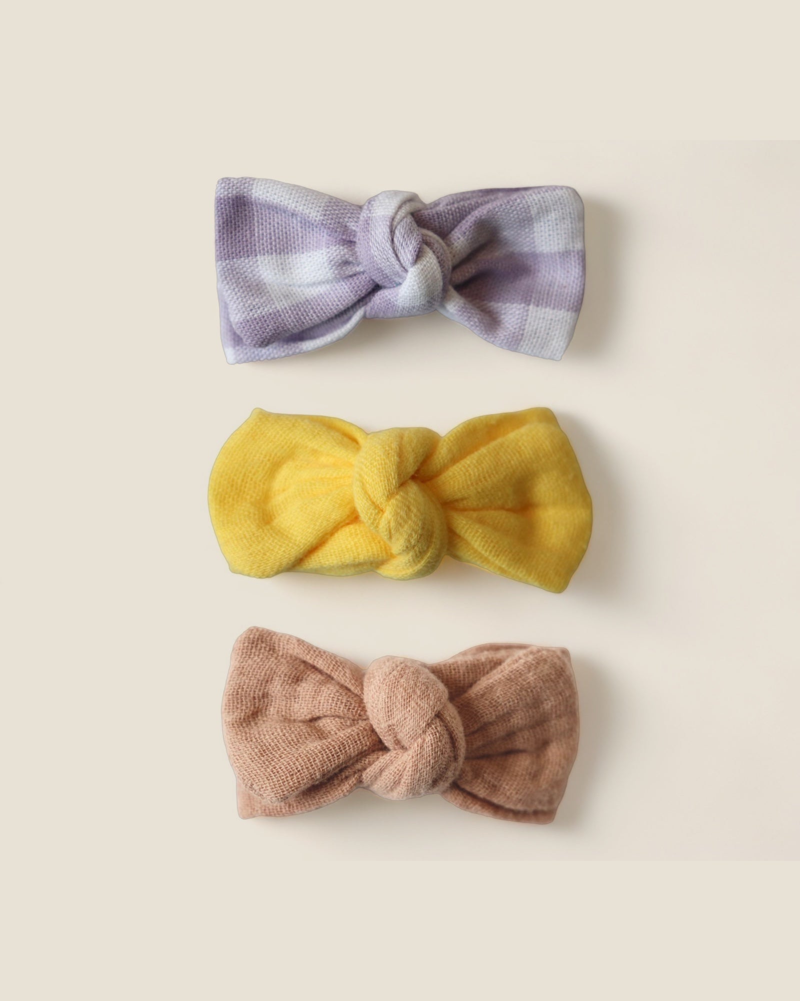 Lot de 3 barrettes Anna Baby ou Girl : gaze Argile, gaze Jaune et vichy Lilas Monture clic-clac cousue sur un noeud en tissu.