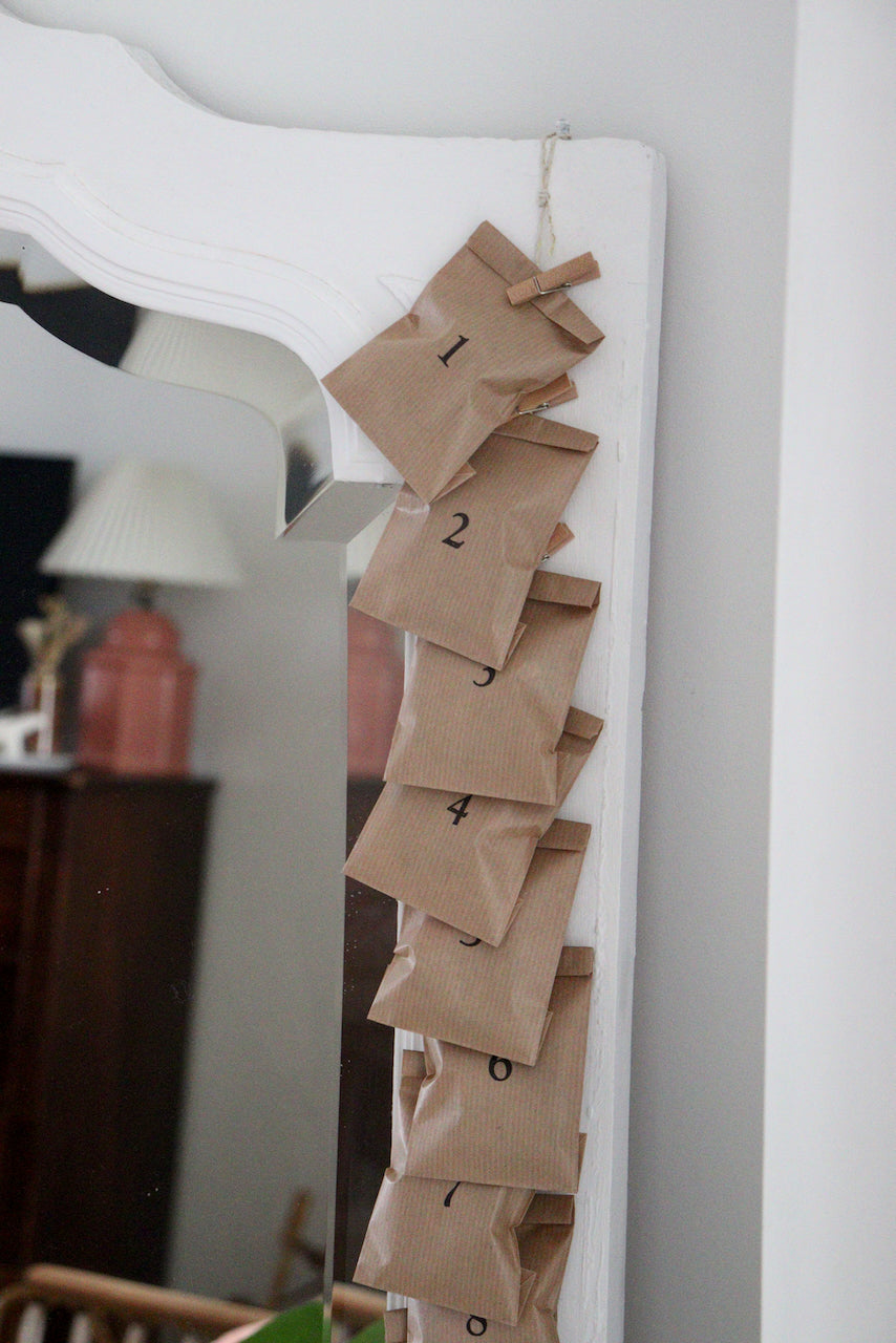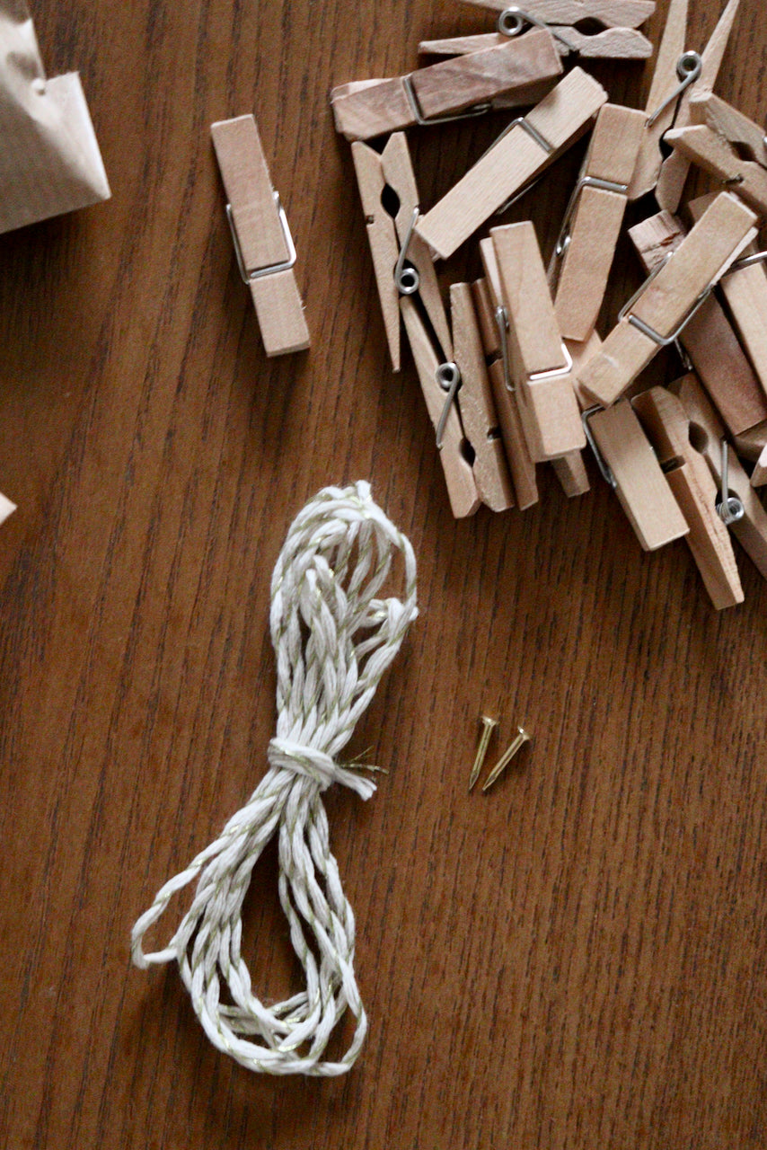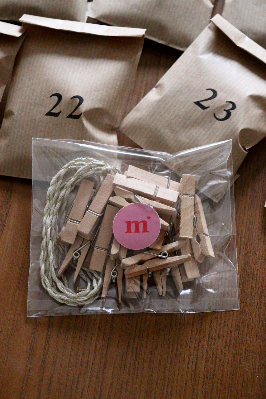 24 pinces à linge, 1 ficelle, 2 petits clous dorés pour accrocher selon vos envies votre calendrier ! (porte, fenêtre, mur..)