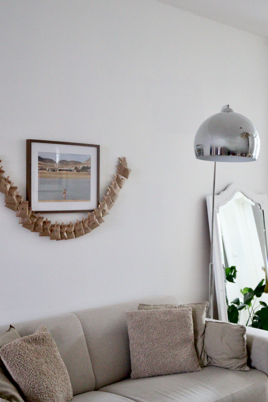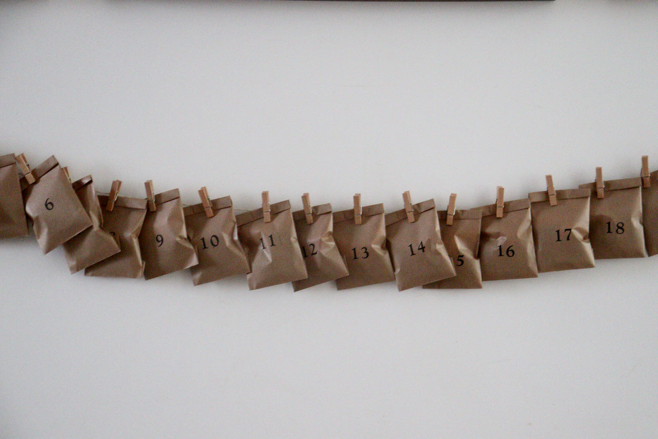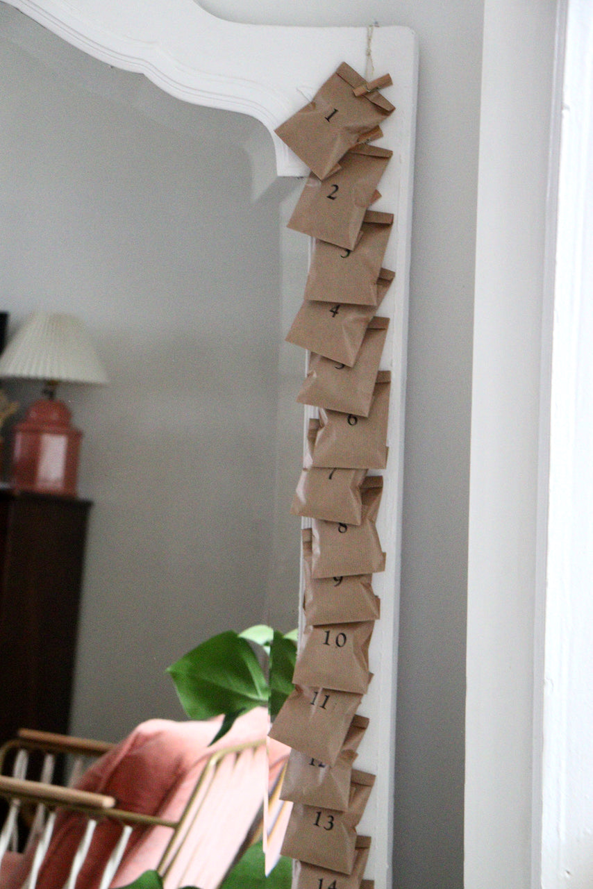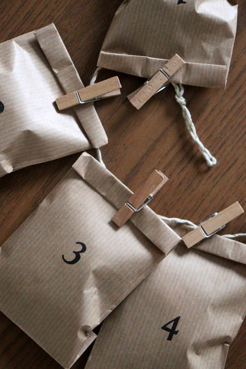 24 pinces à linge, 1 ficelle, 2 petits clous dorés pour accrocher selon vos envies votre calendrier ! (porte, fenêtre, mur..)