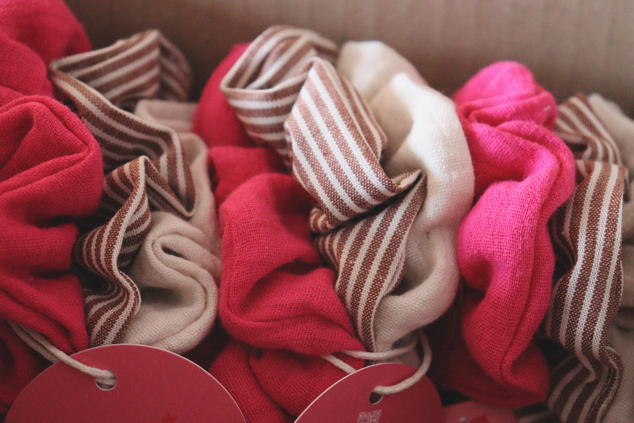 Lot composé de 3 chouchous: gaze Fuchsia, gaze Crème et coton rayé Noisette.