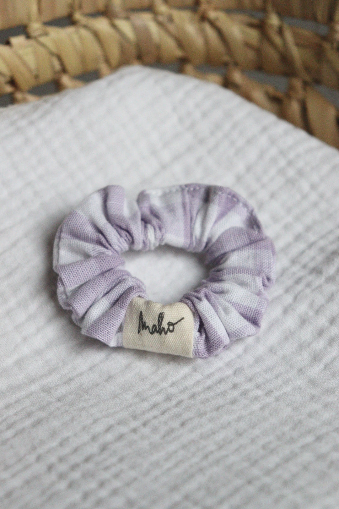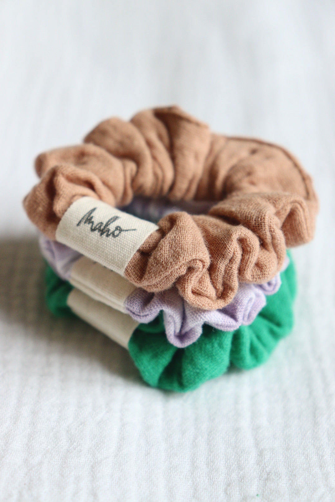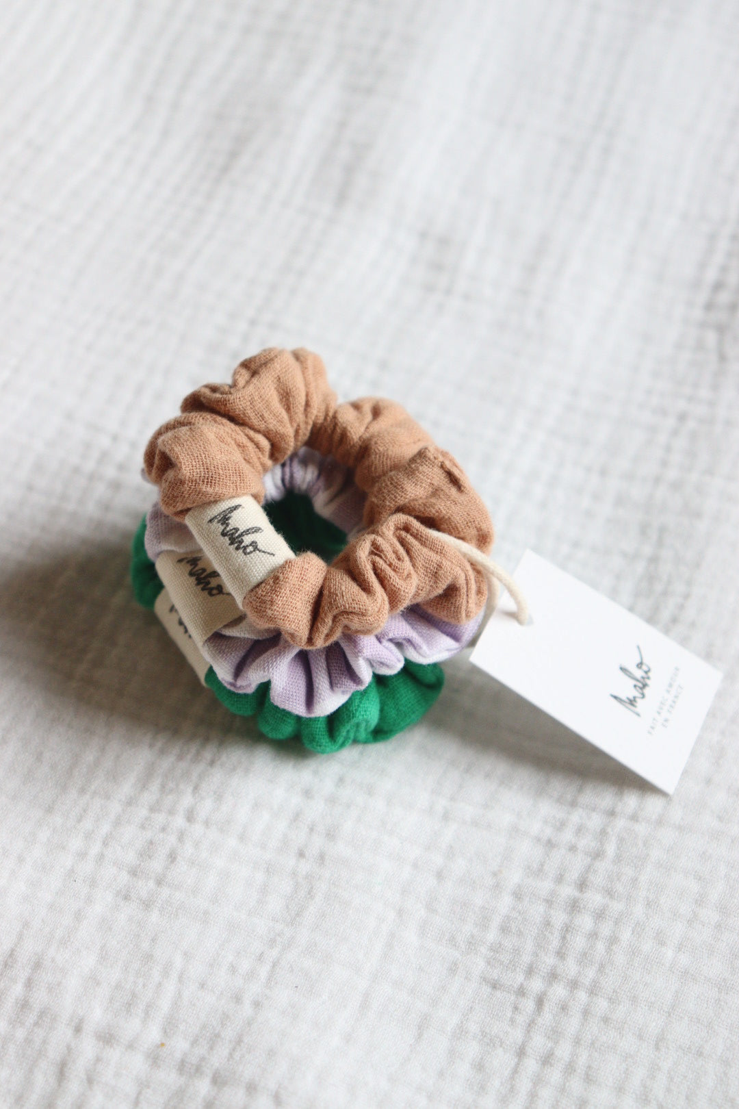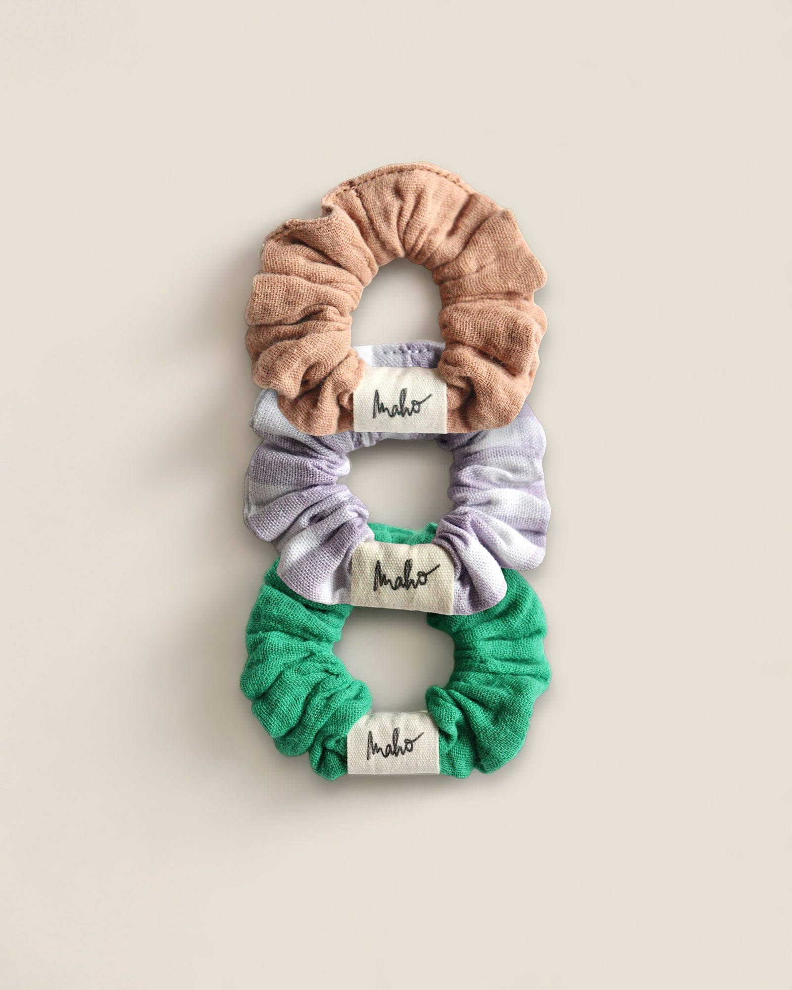 Lot de 3 élastiques Gaby: gaze argile, vert et vichy lilas. Gaby, c'est notre chouchou en tissu pour les petites chevelures ! Deux à trois tours selon l'épaisseur de cette dernière.